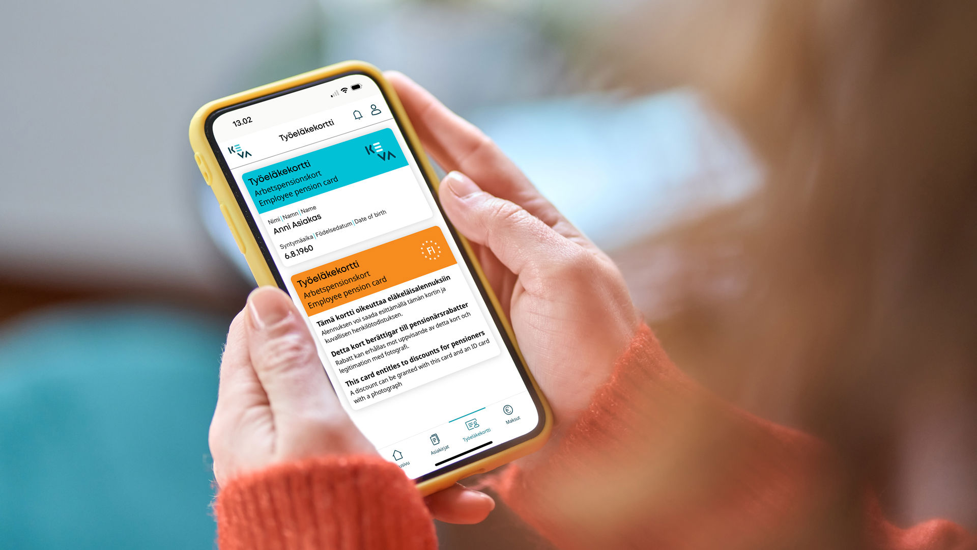 Vuoden 2026 alusta alkaen Kevan asiakkaat saavat työeläkekortin ensisijaisesti sähköisenä. Lataa puhelimeesi tai tabletillesi sitä varten Eläke ja kuntoutus -sovellus.